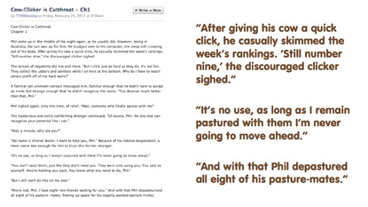And in this cow clicker fanfic, in which a morning revelation forces clicker Phil to better fulfill his clicking potential by depasturing the friends who hold him back.